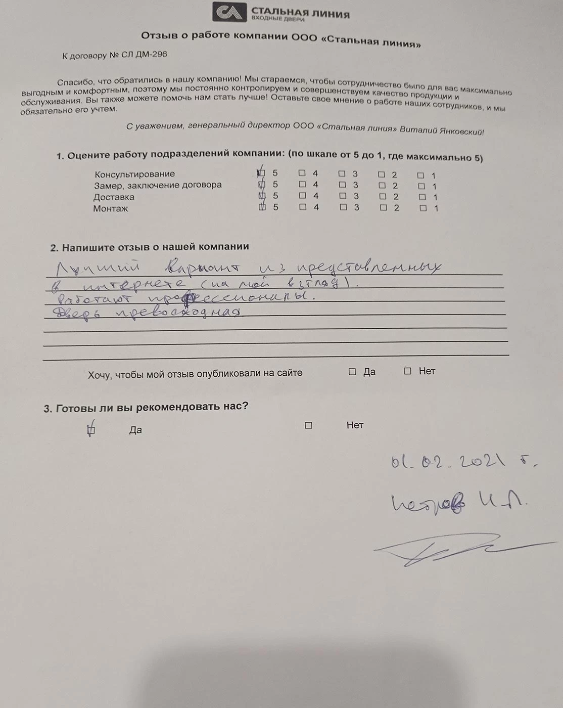 Лучший вариант из представленных в интернете на мой взгляд. Работают профессионалы. Дверь превосходная